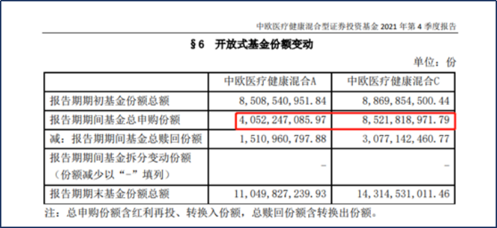 数据显示,去年四季度期间,基民申购中欧医疗健康混合A类份额达40.52亿份,赎回15.11亿份,合计净申购25.41亿份,期末基金份额总额达110.5亿份。