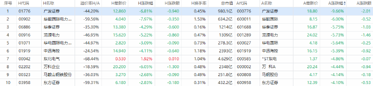 广发证券A股跌9.66%,H股跌6.81%,华能国际电力股份A股跌6%,H股跌7.97%,华泰证券A股跌5.75%,H股跌4.29%。