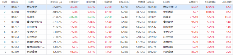 截至发稿,君实生物A股涨12.29%,H股涨6.07%,中铝国际A股涨停,H股涨5.63%,凯莱英A股涨5.52%,H股跌0.94%。