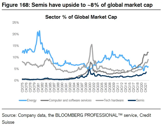 不管有没有元宇宙,半导体已经成为我们日常生活中越来越重要的一部分。 自1977年以来,人均半导体芯片数量从2个激增到146个,大约是70倍,这在很大程度上要归功于个人电脑和手机的普及。虽然近年来,智能手机占全球市场资本总额的比例已从1%增长到3%左右,但Nigam认为,到2030年,智能手机的市场份额仍有可能上升到8%左右。
