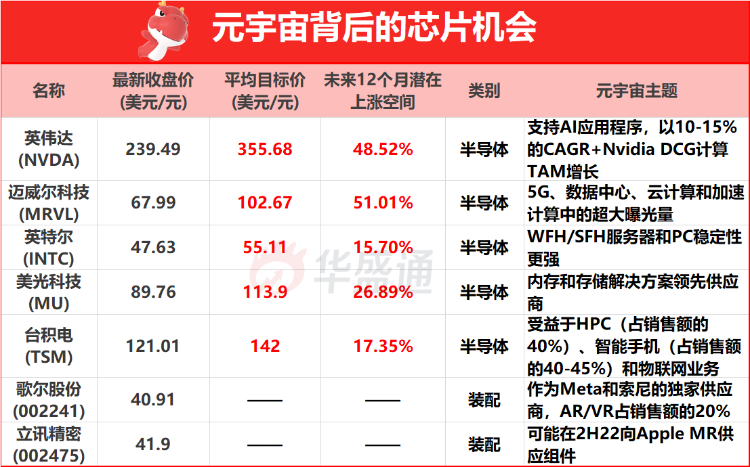 所有这些创新都是元宇宙充分发挥其商业潜力所必需的,因此对于处于有利地位的公司来说,有大量的盈利机会。下面是Nigam和他的团队认为他们在硬件和半导体类股中最看好的7只股票,这些股票涵盖四个子行业——组装、显示器、无源器件和半导体。此外,下面还列出了每家公司的股票代码、目标价格和元宇宙主题。
