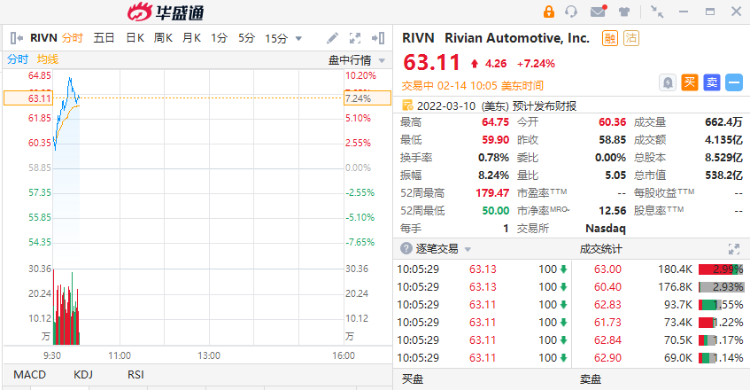 华盛资讯2月14日消息,美股新能源车板块集体走强,截至发稿,Rivian $RIVN 上涨超7%,报63.11美元。