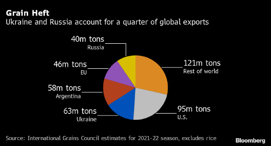 另一个重大损失可能会是食品价格上涨。乌克兰和俄罗斯两国在全球小麦、玉米和葵花籽油贸易中都是重量级供应国,如果供应中断,来自亚洲、非洲到中东的买家很容易会面临面包和肉类涨价的挑战。而当前食品相关的大宗商品成本已经处于十年来最高。