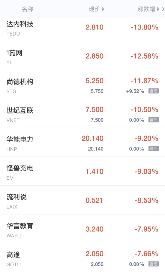 领跌中概股列表: