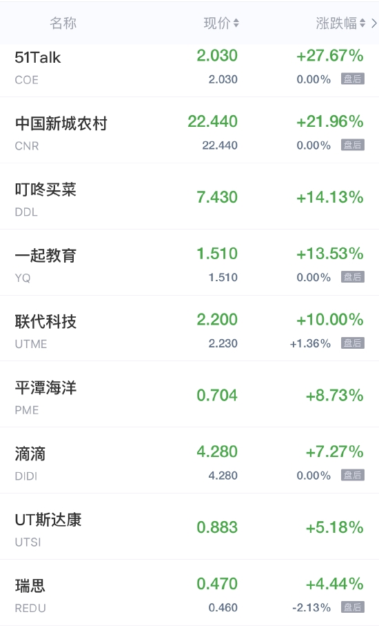 51Talk涨超27%,叮咚买菜涨超14%,一起教育涨超13%,联代科技涨超10%,图森未来、百世集团、瑞思涨超4%,欢聚集团涨超3%,前程无忧涨超2%,途牛、携程涨超1%。