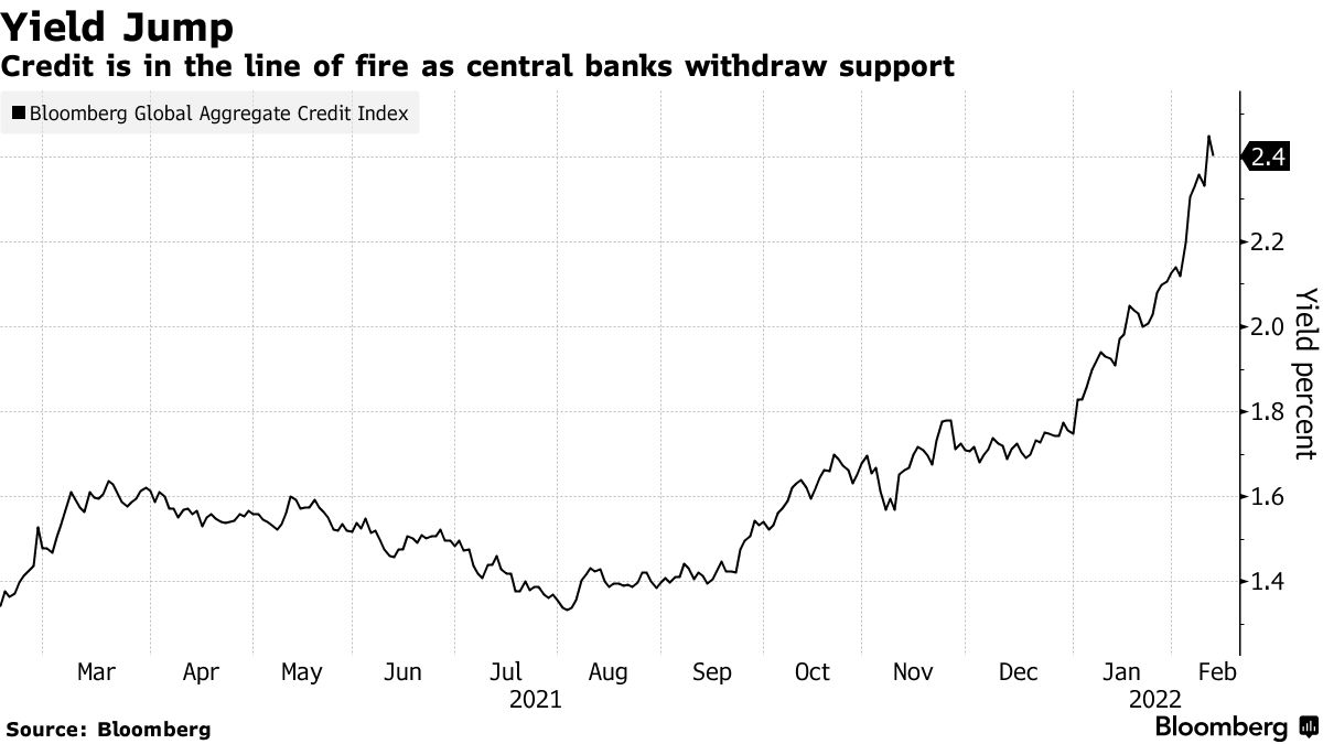 华尔街的观点来自于周一企业债券的下滑,因为俄罗斯在乌克兰附近的军事集结导致紧张局势加剧,投资者涌向避险资产。鉴于对加息和央行缩减资产购买的预期,这使债券投资者今年已经遭受的损失更加严重。