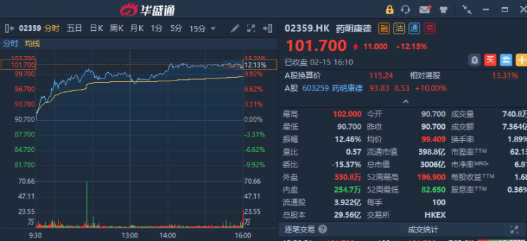 华盛资讯消息,截至2月15日16:19,药明康德(02359.HK)现价101.700元,涨幅12.13%。