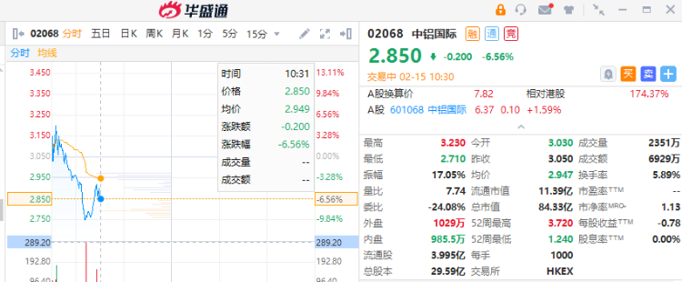 华盛资讯2月15日消息,中铝国际一度跌超9%,现跌超6%,此前公司公告称其A股股价异常波动,不涉及盐湖提锂相关投资业务。