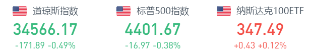 截至2月14日周一收盘,道指跌0.49%报34566.17点,标普500指数跌0.38%报4401.67点,纳指持平报13790.92点。