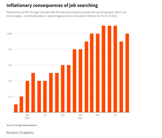根据芝加哥联储周一发布的一份研究报告,在去年的大部分时间里,在职期间寻找工作的人数占比上升,将通胀率推高了约1个百分点。这表明,在2021年的物价涨幅中,跳槽起到的作用大约占20%。