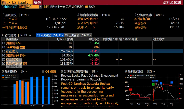 据彭博分析师预期,Roblox 2021财年Q4营收预计约为7.69亿美元。市场分析人士认为,Roblox作为一家上市并不算久的企业,除这几个主要数据值得关注外,未来财报中的现金流数据以及用户粘性指标也很重要。