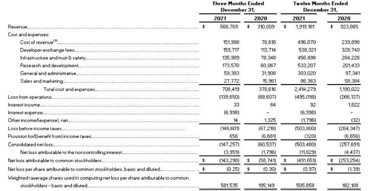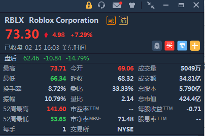 “元宇宙第一股”美国游戏和社交媒体平台Roblox $RBLX 周二盘后公布了四季度财报,营收5.688亿美元,与2020年第四季度相比,收入增长了83%;GAAP每股收益 -0.25美元,Roblox盘后跌15%,Q4业绩不及预期。