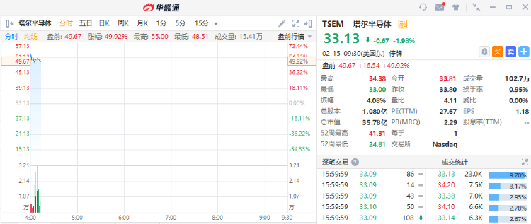 华盛资讯2月15日消息,美股盘前,美股三大指数期货盘前走高,截至发稿,纳指期货涨1.54%,标普500指数期货涨0.99%,道指期货涨0.75%。Tower半导体(TSEM)盘前一度暴涨超53%,现涨幅收窄至49%并停牌。英特尔(INTC)宣布以每股53美元的价格全现金收购Tower半导体(TSEM),交易价值约为54亿美元。