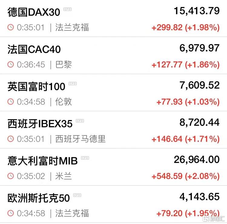 格隆汇2月16日丨消息称部分俄罗斯军队返回基地,市场猜测俄乌紧张局势有望缓和,投资者避险情绪降温。欧股低开高走全线收涨,德国DAX30指数涨1.98%,法国CAC40指数涨1.86%,英国富时100指数涨1.03%,西班牙IBEX35指数涨1.71%,意大利富时MIB指数涨2.08%,欧洲斯托克50指数涨1.95%。