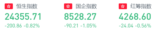 截至2月15日周二收盘,恒生指数跌0.82%,报24355.71点;国企指数跌1.05%,红筹指数跌0.56%。