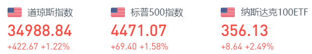 截至2月15日周二收盘,道指上涨422.67点,涨幅为1.22%,报34988.84点;纳指涨348.84点,涨幅为2.53%,报14139.76点;标普500指数涨69.40点,涨幅为1.58%,报4471.07点。
