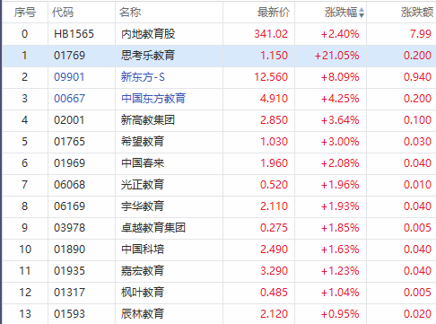 华盛资讯2月16日消息,隔夜美股中概教育股集体收涨,带动港股教育股今早全线高开。截至发稿,思考乐教育涨超20%,新东方在线和新东方-S涨超8%,中国东方教育涨超4%,中教控股、宇华教育、希望教育涨超3%,枫叶教育、光正教育、中国科培等跟涨。