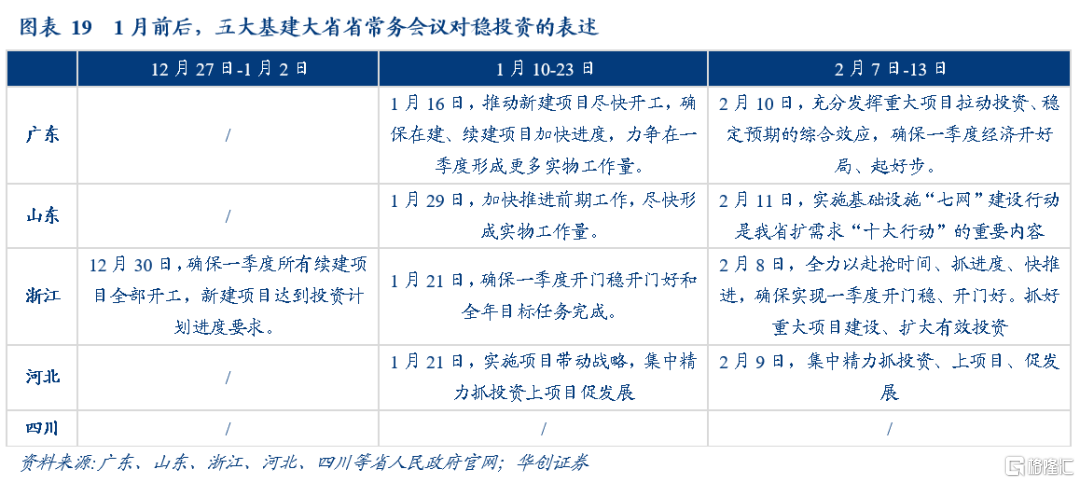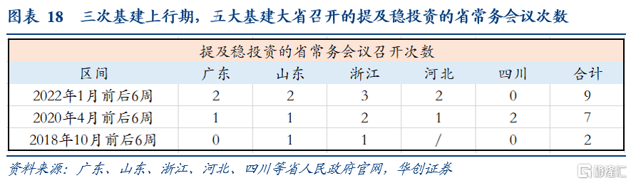 我们发现,当下五大省份对稳投资的诉求明显大于2020年4月、2018年10月。体现在1月前后6周,五大省份合计有9次省常务会议明确提及稳(扩大)投资。作为对比,此前两次分别只有7次、2次。其中,浙江非常积极,去年12月底以来,已经召开了三次省常务会议强调抓好重大项目建设、扩大有效投资。确保实现一季度开门稳、开门好。