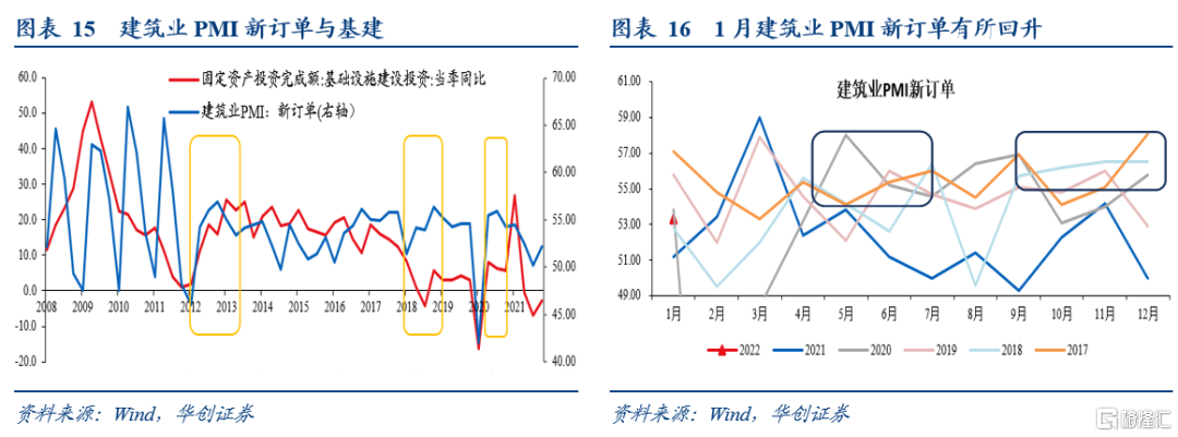 当下的情况看,去年四季度建筑公司订单增速开始转正,回升至6.9%。1月建筑业PMI也回升至过去几年同期中间位置。但与2018年四季度、2020年2季度相比,这些数据的回升力度不够强劲,彼时建筑业PMI新订单基本跳升至近几年同期高位。