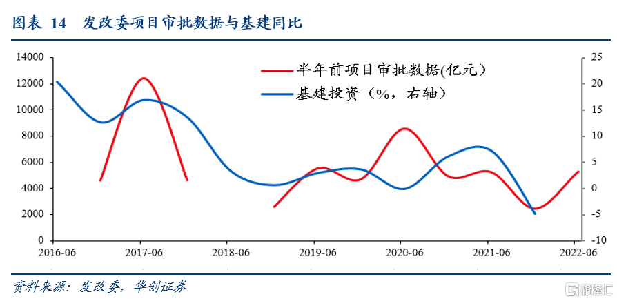 发改委项目审批数据,对基建投资有一定的领先作用。2018年下半年、2021年下半年基建增速的陡降,都与上半年项目审批大幅回落有关。