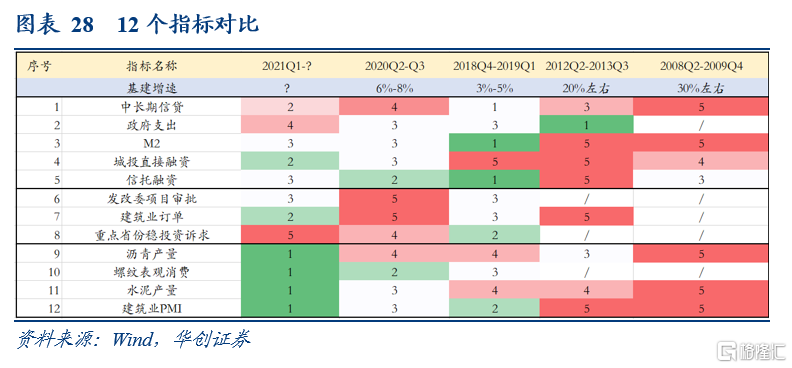 当下合计分值是24分,超过2018Q4-2019Q1的19分。目前尚低于2020Q2-Q3的29分。这意味着,当下基建力度(今年上半年),合意的预期可能是比3%-5%的区间要高,可能接近6%-8%的区间。至于能否更高,可能需要观察这些指标能否进一步上行。值得注意的是,1季度由于基建体量较小,且财政资金更为宽裕,增速超过6%-8%的区间是可能的。
