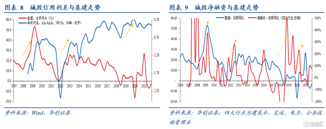 城投直接融资是基建的一个重要资金来源。过往来看,基建上行基本伴随着城投融资的上行以及城投债利差的收窄(AA-AAA)。