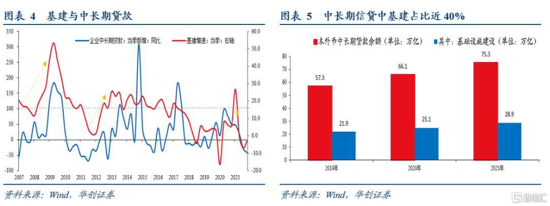 历史来看,基建的四次上行,有三次是伴随着中长期贷款的增速上行。胜率较高的背后,是中长期贷款中,较多的投向是用于基建。近几年的数据看,中长期贷款余额中,接近40%投向是用于基建。