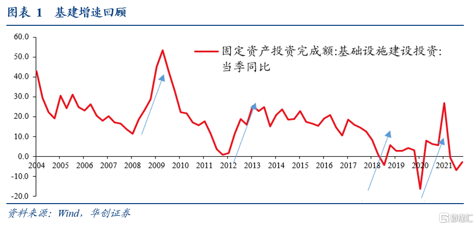 2008年以来,基建增速出现明显上行的时间大概有4次。其中2008-2009年、2012-2013年,两次持续的时间较长,超过1年。每次增速上行,增速高点相比增速低点,可以相差10个点以上(季度增速衡量)。