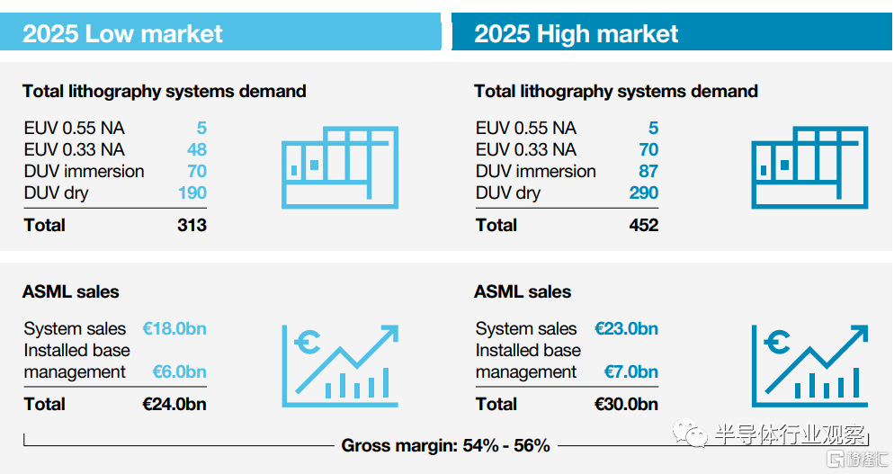 这意味着先进节点和成熟节点对晶圆的需求都在增加,进而提升光刻设备的需求。根据不同的市场场景,ASML认为2025年有望实现240亿-300亿欧元左右的年销售额,毛利率在54%-56%之间。
