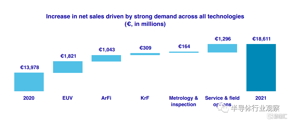 净销售额的增长是由ASML所有技术的强劲需求推动的。ASML在2021年成功出货了42套EUV系统,包括26台用于大批量生产的第一个NXE:3600D。这使得EUV系统在2021年的收入达到63亿欧元,比2020年增加了18亿欧元。