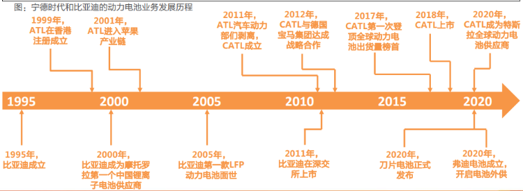 而宁德时代的前身则是1999年成立的新能源科技有限公司(ATL)。2001年,公司锂离子电池进入苹果产业链,2011年动力电池业务剥离成立宁德时代,2018年宁德时代上市,2020年宁德时代成为特斯拉全球动力电池供应商。