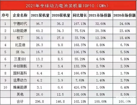 截至2021年数据显示,宁德时代仍稳居全球动力电池装机量第一的宝座,市场份额超过30%。不过比亚迪也迅速崛起,在开放电池供应后,2021年装机量以26.3Gwh排名第四,市场占有率达到8.8%。