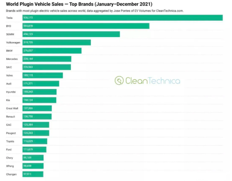 根据Clean Technica公布的数据来看,2021年全球新能源车型累计销量近650万辆,而特斯拉和比亚迪分别占据了前两名,这还是在比亚迪未开拓海外市场的情况下取得的成绩。