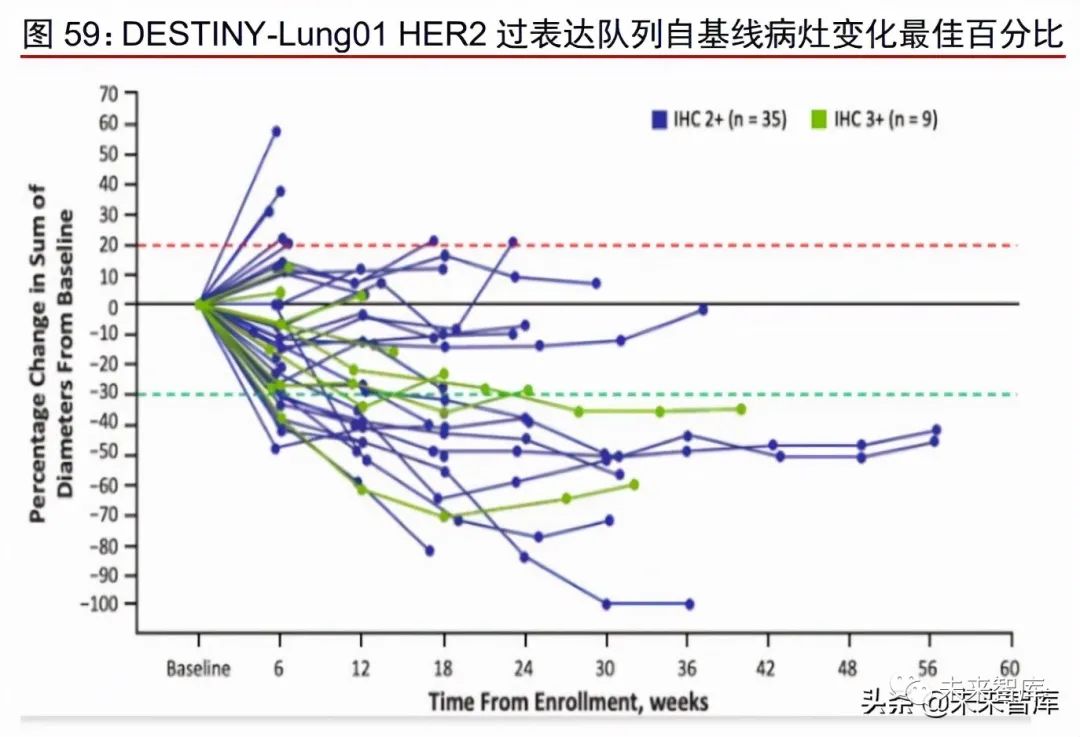 Enhertu 治疗 HER2 过表达 NSCLC 患者 ORR 为 24.5%。DESTINY-Lung01 是一项 开放标签、多中心的 II 期临床试验,旨在评估 Enhertu 用于治疗 HER2 过表达或突变的不 可切除可/或转移性非小细胞肺癌(NSCLC)患者的疗效。WCLC 2020 和 ESMO 2021 分别 更新了 HER2 过表达队列和 HER2 突变队列的研究结果。WCLC 2020 公布数据显示,截 止至 2020 年 5 月,HER2 过表达 NSCLC 患者队列共 49 位患者接受 Enhertu 治疗,ICR 确认的 ORR 为 24.5%(95% CI: 13.3%-38.9%),DCR 为 69.4%,中位 PFS 为 5.4 个月。其中 IHC2+和 IHC3+患者 ORR 分别为 25.5%和 20.0%。