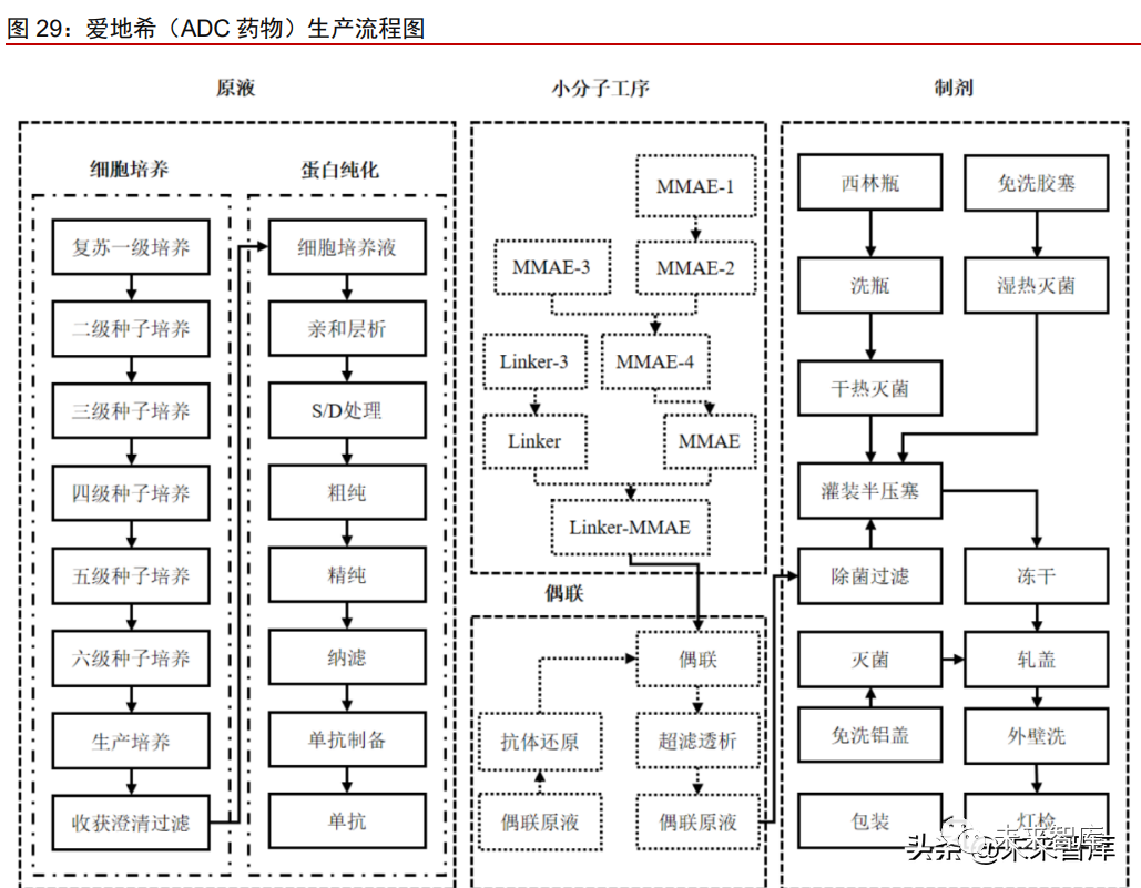 ADC 药物研发生产技术复杂,对药企相关能力要求较高。ADC 药物极大的治疗潜力 使其成为国内外众多创新药企业加码布局、研发的热门方向。ADC 药物的设计研发不是抗 体、连接子、细胞毒素三部分的简单结合,需要选择合适的组合使整体疗效和安全性达到 最优。生产工艺同样复杂,包含了单抗、原液、制剂等多个生产环节,尤其是生物偶联技 术,门槛高,难度大。这些因素对 ADC 药物原研企业的研发生产及商业化能力提出巨大 挑战。