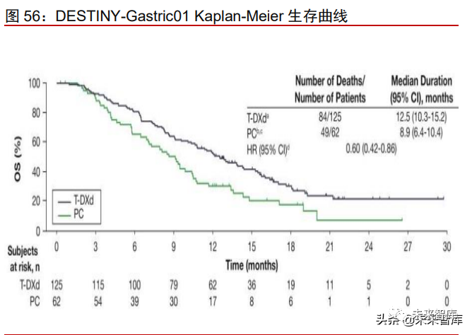 Enhertu 优于化疗方案,成为 HER2+胃癌首个获批的 ADC 药物。基于一项开放标签、 多中心、II 期临床试验 DESTINY-Gastric01 的研究结果,Enhertu 被 FDA 批准上市用于治 疗 HER2 突变的胃或胃食管交界腺癌,成为 HER2+胃癌首个获批的 ADC 药物。该研究对 比Enhertu和研究调查员选择的化疗用于治疗HER2阳性的不可切除/转移性胃或胃食管交 界处腺癌患者的有效性和安全性。截止至 2021 年 6 月,试验结果显示:在 175 例可评估 患者中,Enhertu 组 ORR 为 40.0%,远高于化疗组 12.5%。Enhertu 组的中位 OS 为 12.5 个月,化疗组为 8.9 个月,133 例达 OS 事件数,成熟度为 71.1%。Enhertu 组与化疗组 相比死亡风险降低 40%(HR=0.60;95%CI:0.42-0.86),充分说明 Enhertu 抗肿瘤活性优 于化疗方案。两组发生≥3 级不良事件的概率分别为 85.6%和 56.5%,Enhertu 组副作用 较对照组更高。