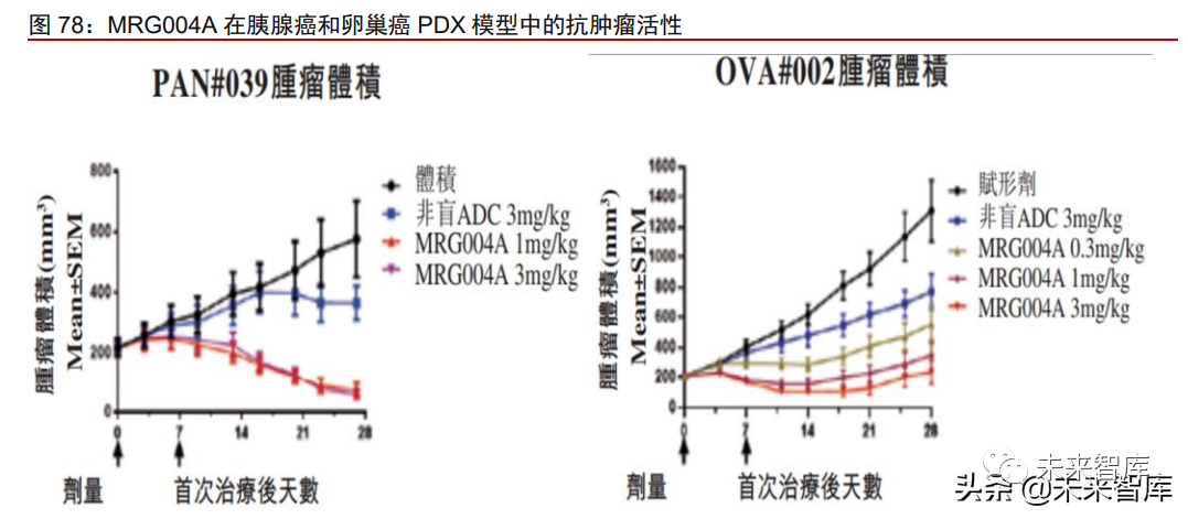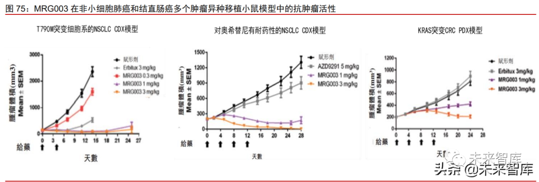 MRG003 有望克服 EGFR-TKI 耐药突变的临床难题。MRG003 由人源性 EGFR 单克 隆抗体、可剪切 VC 连接子和小分子毒素 MMAE 连接而成。EGFR-TKI(EGFR 酪氨酸激 酶抑制)已广泛应用于 EGFR 突变或异常表达的肿瘤患者,然而部分患者接受小分子 EGFR-TKI药物治疗出现获得性耐药突变,成为亟待解决的一大临床难题。MRG003强大、 广谱的抗肿瘤疗效在多种肿瘤小鼠模型(包括 CDX 模型和更具临床相关性的 PDX 模型) 研究中得到证实。例如,在对第三代 EGFR-TKI 奥希替尼具有耐药性的 NSCLC PDX 模型 LUN2210-4a 中测试 MRG003 的抗肿瘤活性,MRG003 呈现出剂量依赖性的抗肿瘤活性, 3mg/kg 剂量下在第 28 天彻底根除肿瘤。因此,MRG003 最大的临床优势是有望克服 EGFR-TKI 引起的多种获得性耐药突变,满足这类患者的临床需求。