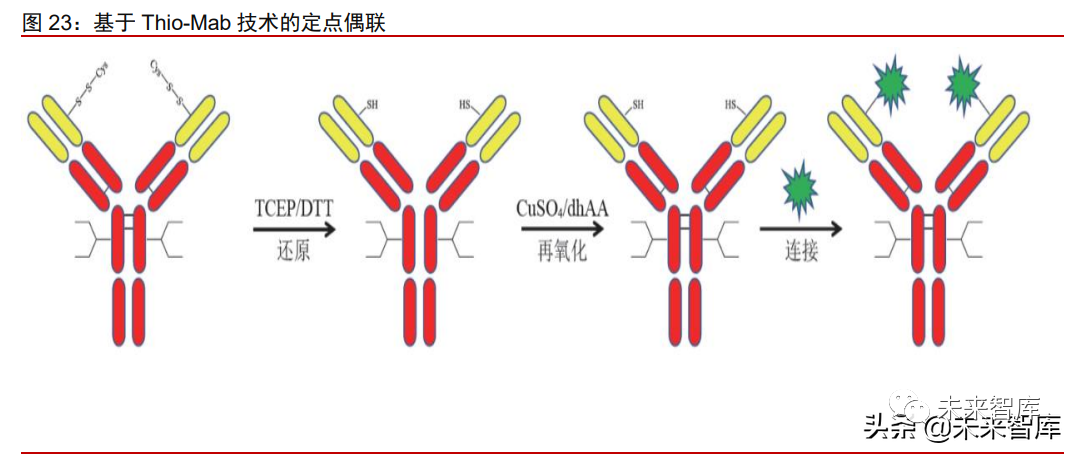 Thio-Mab 技术:Thio-Mab 技术由 Genetech 首先开发,在抗体 Fab 表面筛选出 反应性半胱氨酸的突变位点(曲妥珠单抗的 LC-V110 和 HC-A114)进行半胱氨 酸突变,利用三(2-羧乙基)膦(TCEP)或二硫苏糖醇( DTT)只打开抗体链 间二硫键,并使突变的半胱氨酸的巯基处于自由态,再应用 CuSO4 或脱氢抗坏 血酸( dhAA)将链间二硫键重新连接,最后利用游离巯基与药物连接子反应, 实现抗体药物定点偶联。