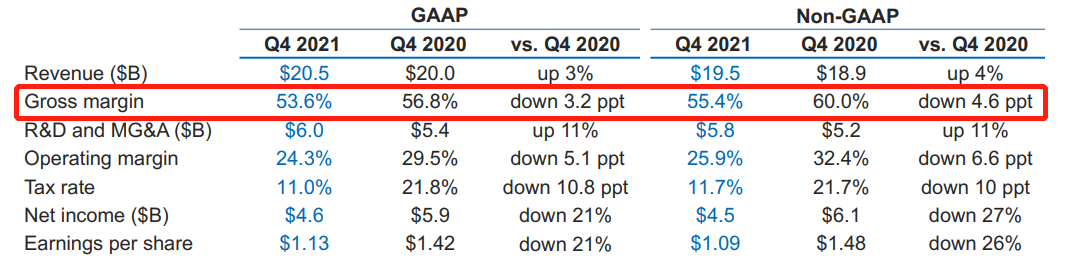 价值研究所也观察到,综合华尔街多家顶级投行对高塔半导体2022年业绩预期来看,其毛利率预计不会高于30%。而过去几个季度,英特尔的毛利率都不低于50%,四季度的最新数据是55.4%——这还是在同比下滑4.6%的情况下取得的成绩。