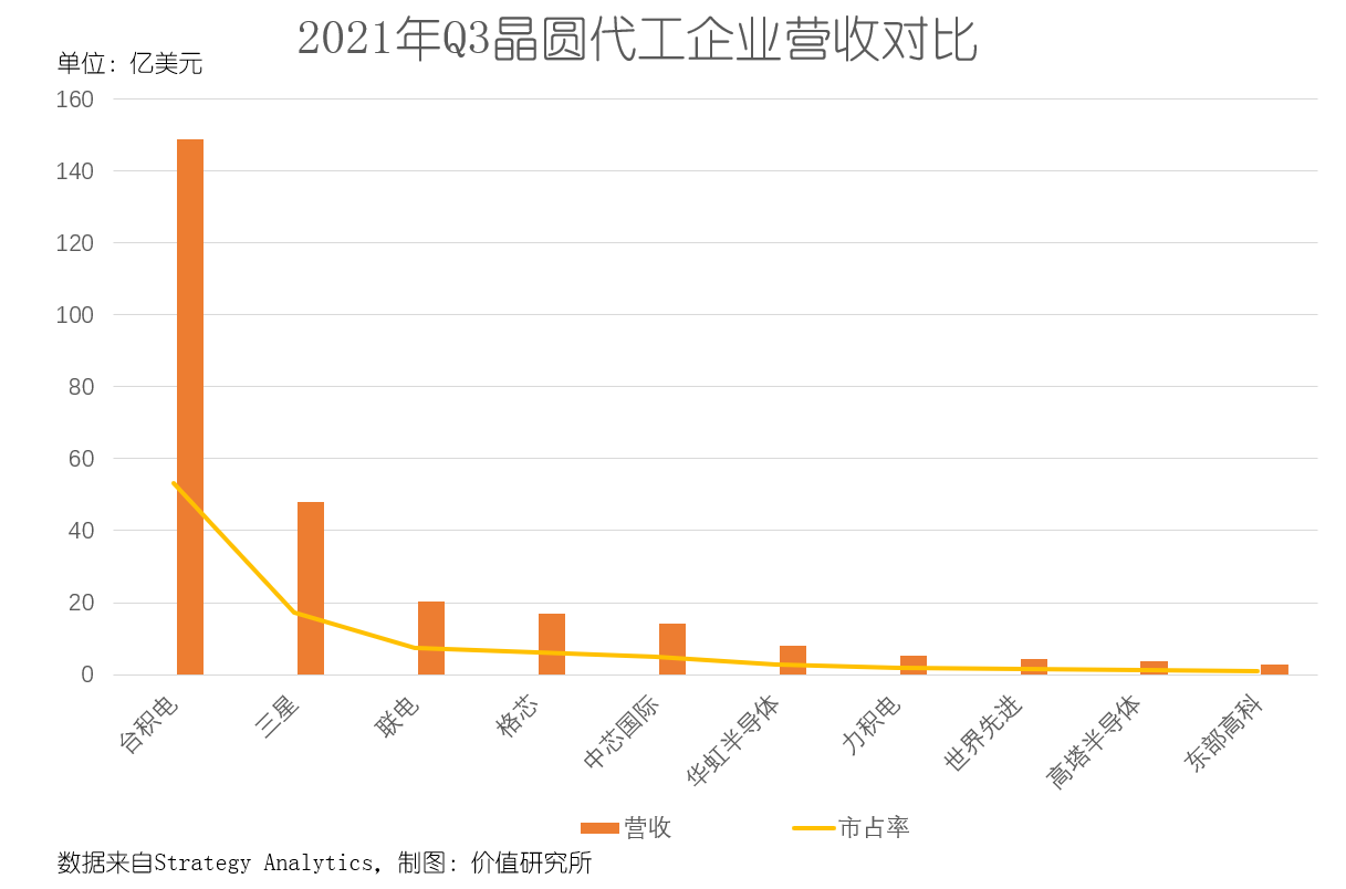 从产能来看,台积电和三星基本独一档,和后面的竞争对手拉开了很大差距。