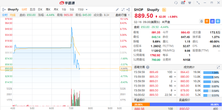 周三(2月16日)美股盘前,Shopify(SHOP)公布了其第四季度财报,Q4营收13.8亿美元,同比增长41%,预期13.4亿美元;净亏损3.71亿美元,并表示第四季度净亏损包括来自股权和其他投资的5.097亿美元未实现净损失。财报公布后,Shopify盘前一度涨7%,后转跌,截至发稿,该股跌超4%。