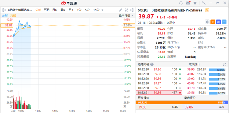 华盛资讯2月16日消息,美股早盘,纳指跌近1.2%,3倍做空纳斯达克指数ETF SQQQ涨近4%。板块中,明星科技股多数走弱,截至发稿,推特(TWTR)、奈飞(NFLX)跌超2%,Meta (FB) 跌超2%,台积电(TSM)、英伟达(NVDA)、美光科技(MU)、苹果(AAPL)等跌超1%。