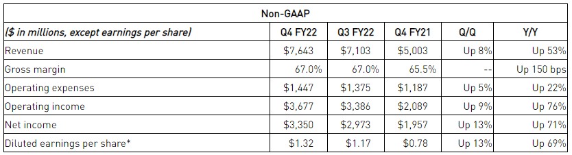 财报显示,该公司第四季度营收再创新高,同比增长53%至76.43亿美元,高于分析师74亿美元的平均预期。在非GAAP会计准则下,净利润为33.50亿美元,同比增长71%;摊薄后每股收益为1.32美元,高于分析师预期的1.22美元。调整后的毛利率为67.0%,略低于分析师预期的67.1%。