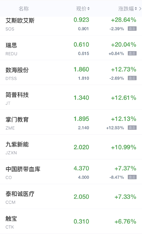 瑞思涨超20%,掌门教育涨超12%,九紫新能涨近11%,雾芯科技涨近6%,51Talk涨5%,中网载线、迅雷、知乎、人人公司、斗鱼涨超2%,哔哩哔哩涨近2%,极光、前程无忧、陆金所、贝壳涨超1%,微博涨近1%。