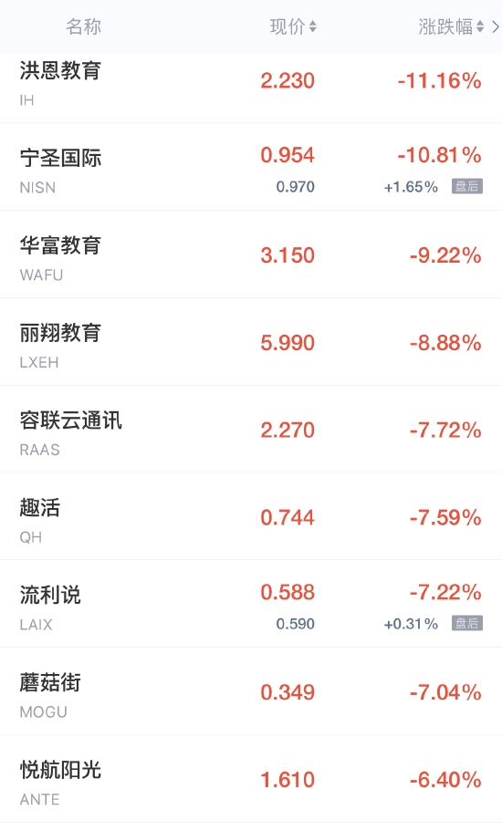 洪恩教育跌超11%,华富教育跌超9%,流利说、蘑菇街、趣活跌超7%,好未来、第九城市跌超4%,金山云跌近4%,搜狐、汽车之家、途牛、趣头条、凤凰新媒体跌超2%,一起教育跌超3%,虎牙跌近2%,爱奇艺、乐居、微美全息、携程、京东、新东方、拼多多、叮咚买菜跌超1%。