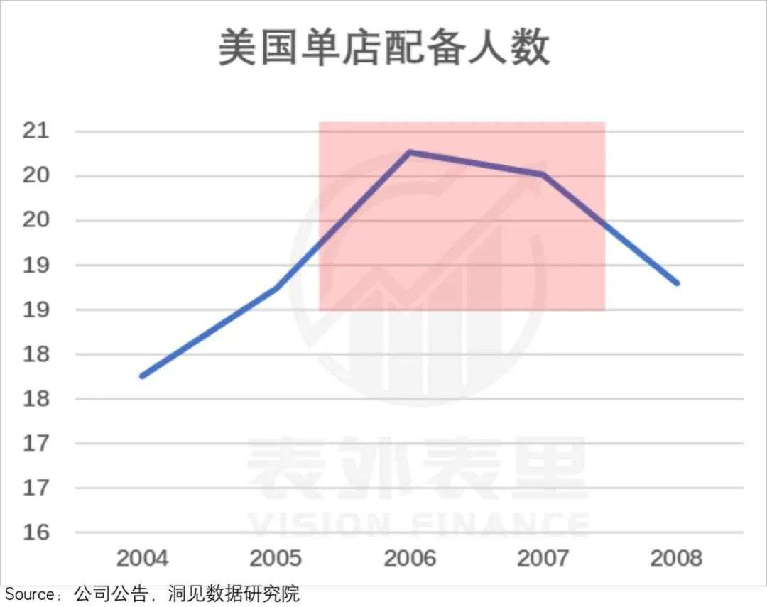 可这一时期,在门店销售额下滑的情况下,星巴克的单店配备员工数,却大幅增加,甚至在2006年最高达21人。