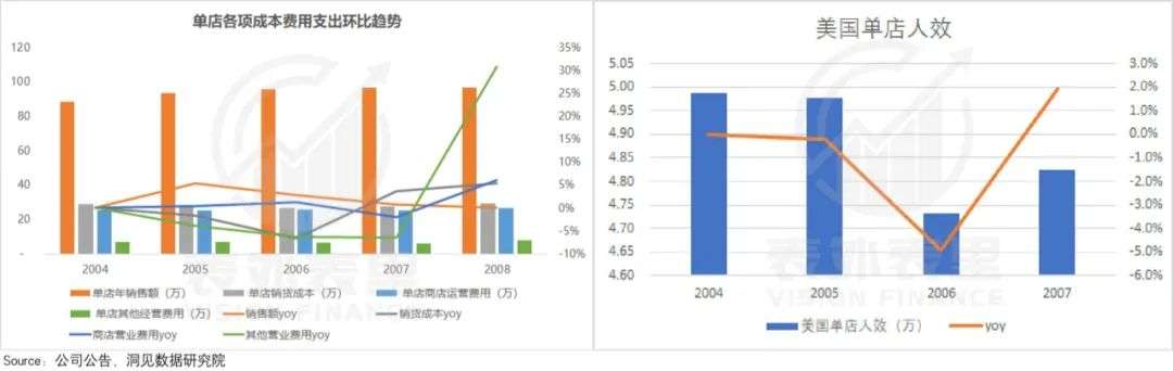 数据显示,2000-2008年,伴随着门店快速扩张,管理难度的提升,星巴克的管理和总部运营等非门店人员数量攀升。这带来了管理费用的拉涨。
