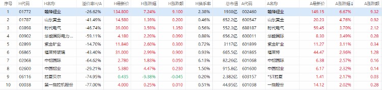 截至发稿,赣锋锂业A股涨6.67%,H股涨7.24%,山东黄金A股涨4.76%,H股涨1.39%,时代电气A股涨3.7%,H股涨3.59%。