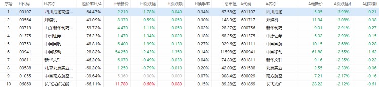 四川成渝高速公路A股跌3.99%,H股跌1.78%,郑煤机A股跌3.08%,H股跌0.59%,中国移动A股跌2.55%,H股跌2.43%。