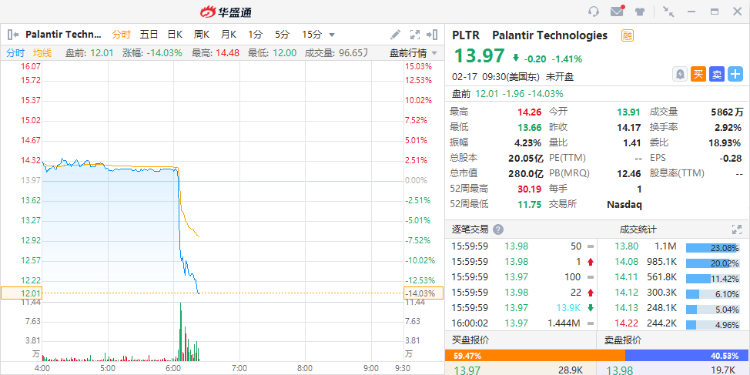周四美股盘前,大数据企业Palantir公布了第四季度财报,财报显示,公司第四季度营收同比增长超34%至4.33亿美元,市场预期为4.14亿美元;净亏损1.56亿美元,市场预期亏损1.08亿美元,去年同期亏损1.48亿美元;每股亏损0.08美元。财报发布后,该股盘前跳水,截至发稿跌超14%。